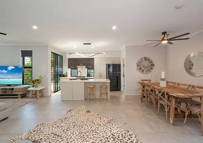A landing on the upper level separates the master suite from a two-bedroom guest wing. Featuring a lavish bathroom with spa bath, the master suite spills out to a fabulous roof-covered deck which is a fantastic place to enjoy a balmy night in complete privacy.