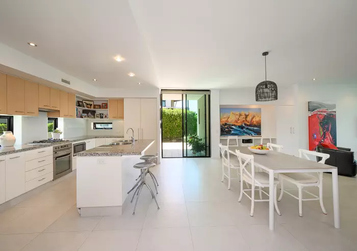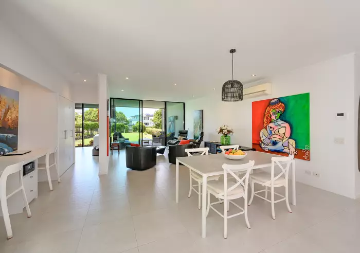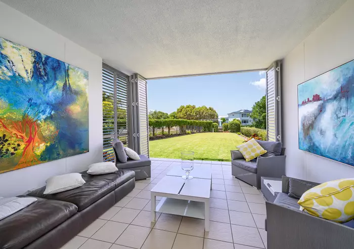 Water frontage Outdoor entertainment area Close to beach Split System Air Conditioning Only one neighbour Garden apartment Irrigation system High ceilings Ensuites x 2 Terrace/Paved Courtyard Undercover outdoor area Low maintenance Safety Switch Smoke Alarms Secure Parking Gated Built-in wardrobe Dishwasher Intercom system Pet friendly NBN ready Office nook 300m to Golf course Private pathway entry Study